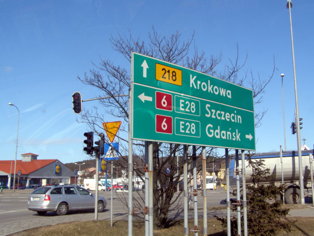 Dojeżdżamy do ronda w Krokowej. Stąd wybierając 3 zjazd, czyli w lewo możemy dojechać do Dębek - 7km lub Białogóry - 17 km. My wybieramy 1 zjazd, kierunek : Karwia - 10 km , Jastrzębia Góra 15 km.
