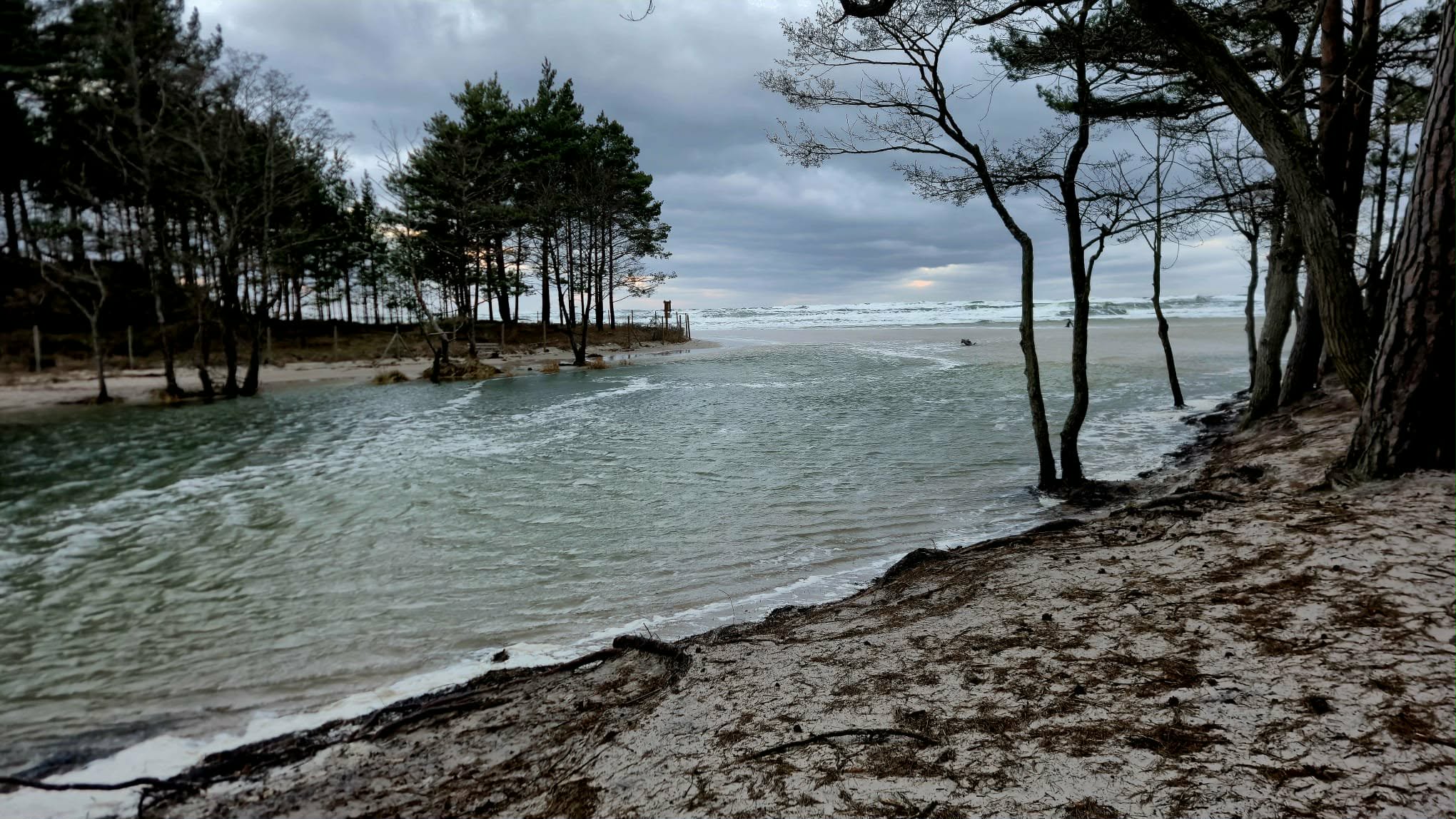 Sztorm na Bałtyku – zalana plaża i wylew rzeki